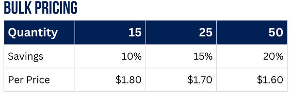 Below are the available bulk discount rates for each individual item when you purchase a certain amount